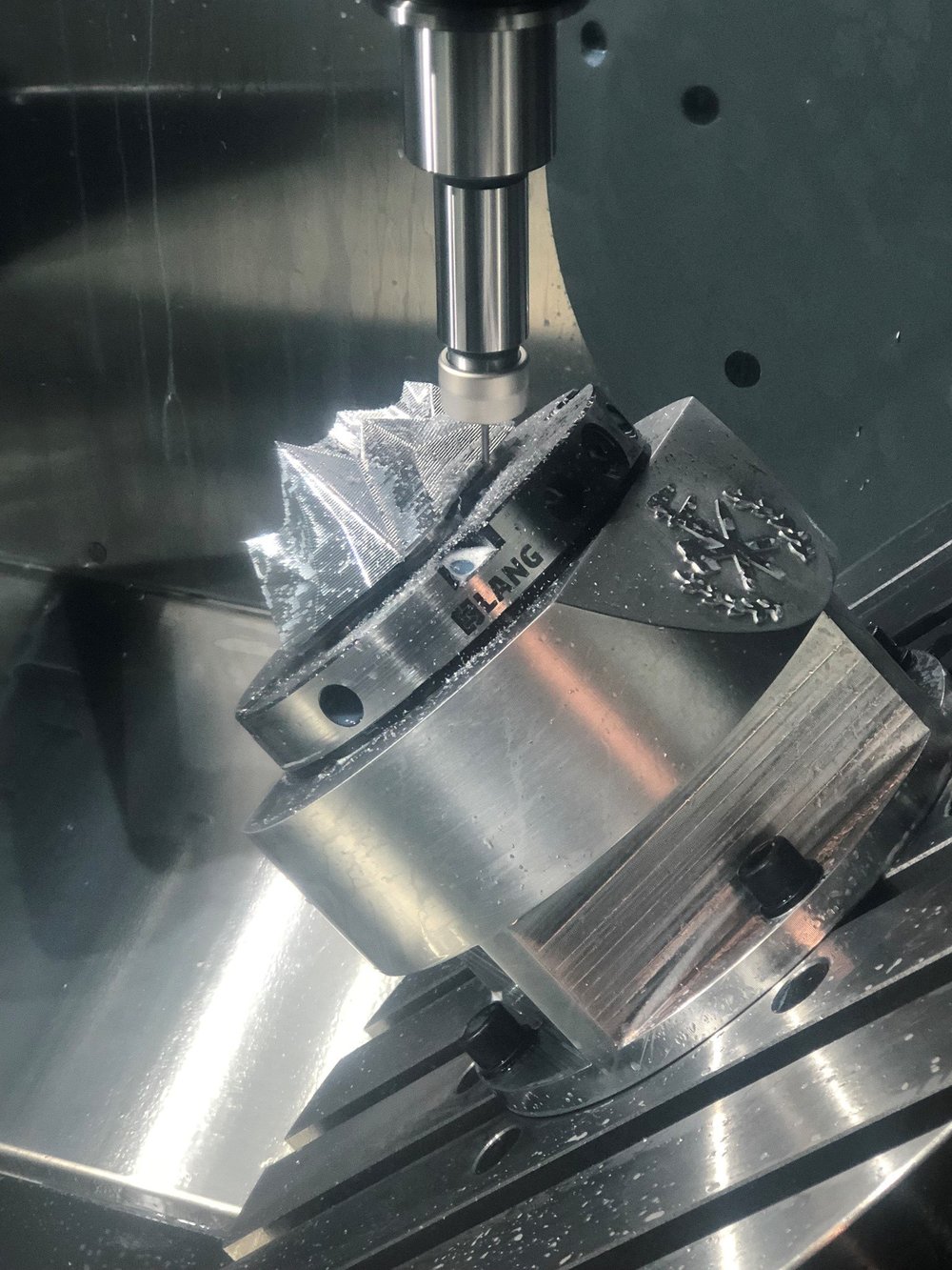 The metal base was designed to be milled on 5-axis CNC machining equipment. Since the form has shallow cosmetic surfaces, the base would be impossible to be created on a 3-axis machine. The bottom was machined first with the feet of the trophy being the mounting points for the 5-axis machine holding. With this method, creating detail on the bottom of the trophy was accomplished while simultaneously creating features to easily fixture the part to the 5-axis machine. The machining design was a collaboration between the designer and the machinist, with a lot of the aesthetic detail being added to the part in the toolpath design.